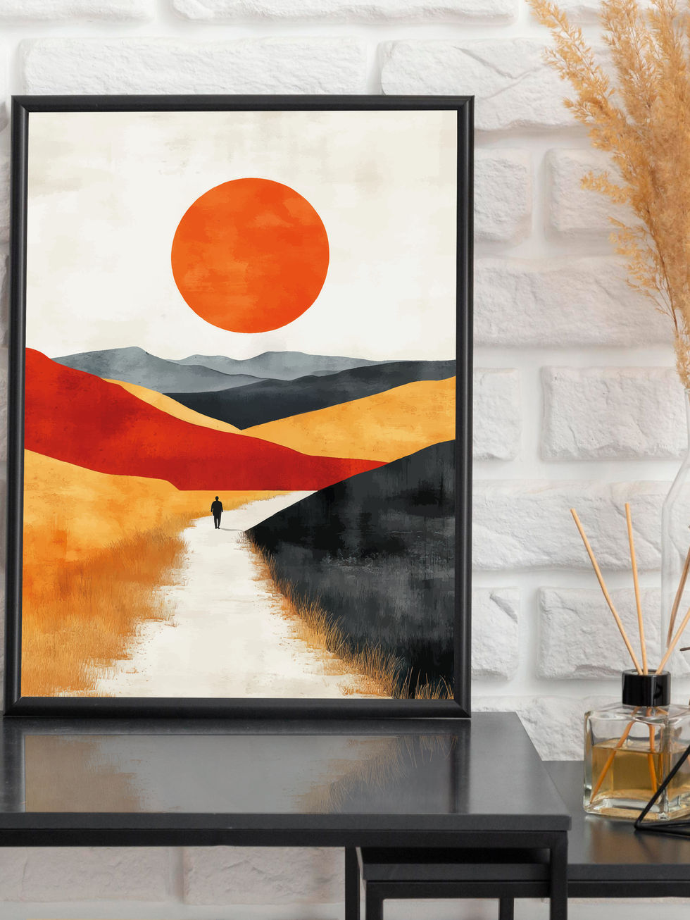 Bu etkileyici poster, geniş boşluk kullanımı ve katmanlı renk bloklarıyla tasarlanmış minimalist bir manzara illüstrasyonudur. Yüksek, kızıl dağ sıraları, altın sarısı vadiler ve öne doğru uzanan beyaz patika; büyük turuncu güneş ile birleşerek yalnızlık, keşif ve içsel yolculuk temalarını sakin ama güçlü bir görsellikle ifade eder. İnce fırça dokuları ve sınırlı palet, postere hem retro hem çağdaş bir hava kazandırır—oturma odaları, çalışma alanları, stüdyolar ve galeriler için ideal bir vurgu parçasıdır.