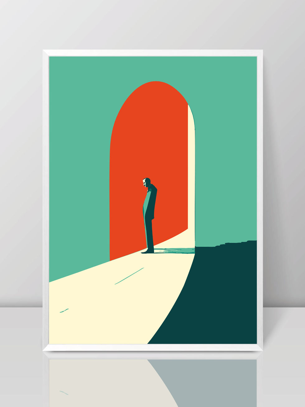 Bu çarpıcı poster, geniş negatif alan ve güçlü renk blokları kullanarak yalnız bir figürün kapı eşiğinde duruşunu betimleyen minimalist bir kompozisyon sunuyor. Turkuaz zemin, parlak krem ışık yolu ve derin kırmızı kapı arka planı; yalnızlık, geçiş ve içsel sorgulama temalarını simgeler. Az ama etkili detaylarla oluşturulan siluet ve uzun gölge, mekâna sinematik bir atmosfer katarken modern ve çağdaş dekorlarla kusursuz uyum sağlar.